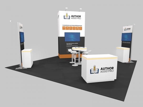 When designing an island exhibit it's often best to use an existing design. The RE-9209 rental island is a great starting point. It begins with a 12 ft. high tower with closet storage, large format graphics, and large monitor mount capability. There are two double-sided workstations with custom counters and even more monitor options. The reception counter is ideal for vinyl graphics and the programmable LED accent lights ensures you can "tune" the lights to match your branding colors. Finally, there's bistro charging table, also with RGB programmable lights, for meeting with clients on the show floor.